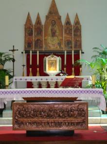 È sormontato da copia del famoso polittico a cinque ante cuspidate (l’originale oggi è al museo diocesano; in sede esiste una gigantofotocopia alta eguale), con disegni suddivisi in 9 scomparti maggiori e 7 minori, tempera su tavole di pioppo, dimensioni 217x257.