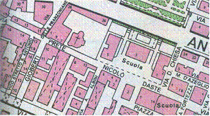 da Vinzoni, 1757 – in rosso creusa dei Buoi; fucsia, via della Cella-sal.Belvedere; ocra, vico Stretto; blu, via Larga