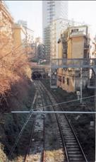 A metà percorso: a sinistra, una grata impedisce di vedere la sottostante imboccatura della galleria - anch’essa chiamata dei Landi - che collega il parco del Campasso col porto (la galleria nel periodo dei bombardamenti aerei alleati, era divenuto un rifugio e, per i già disastrati addirittura un luogo di residenza; vi correvano terrorizzati gli abitanti vicini, ingorgando l’entrata, attraverso l’officina sita in via GB Sasso che possiede ancor ora una porta che da accesso alla linea ferroviaria; i nazifascisti approfittandosene, vi facevano delle retate di partigiani: vengono ricordati alcuni che catturati, vennero poi deportati nei lager tedeschi da cui non fecero più ritorno. A metà percorso , la galleria era raggiungibile anche da via Cantore: questo ingresso fu poi usato per costruire l’ascensore con cui salire all’ospedale);