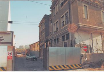 In pieno lavori, la banda rossa segna l’ex tragitto della strada; e la facciata delle costruzioni, la ex via Bombrini