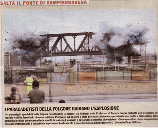 Il ponte ferroviario sul torrente (eretto negli anni ’30), è stato demolito in due tempi; il secondo, messo in atto il 27 sett. 08 con 32 cariche esplosive (=18 kg di esplosivo) collocate sui pilastri di supporto, scoppiate alle 13,50. L’operazione è stata diretta dall’esperto Danilo Coppe coadiuvato da specialisti della brigata paracadutisti della Folgore su richiesta della Prefettura. Per evitare schegge ed onda d’urto, la zona di esplosione è stata ‘fasciata’ da materassi e bolle d’acqua specifici.